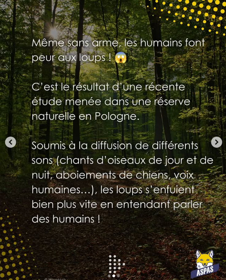 Une étude récente, menée en Pologne dans la forêt de Tuchola et publiée dans la revue Current Biology, a cherché à établir comment les loups allaient réagir à la voix humaine. Pour ce faire l’équipe de chercheurs - dont a fait partie la chercheuse française Elise Say-Sallaz, spécialiste en écologie de la relation entre proie et prédateur - a installé dans la forêt 24 caméras équipées de haut-parleurs et munis de sons de différentes natures - chants d’oiseaux de jour ou de nuit, aboiements de chiens, voix humaines variées…